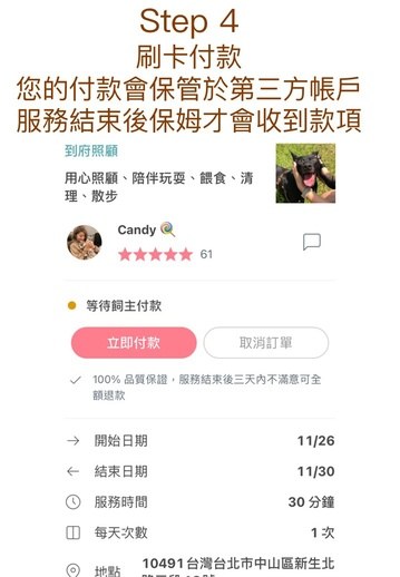 偶爾需要出差好幾天,都擔心狗狗沒人帶散步會憋尿會生病,寵物旅館又貴到爆,後來發現這個程式,簡直方便極了nn第一次使用就遇到一個超溫柔體貼的女保母,我家狗狗給她帶都超開心的